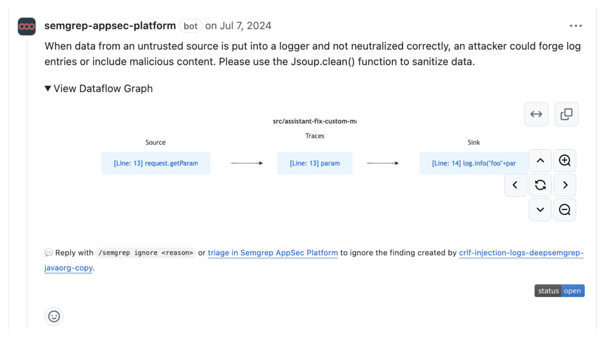 LLMs excel at reading code and interpreting intent, making them well-suited for evaluating security findings. Autotriage leverages this capability by using LLMs and retrieval augmented generation to assess the likelihood of any given Semgrep finding being a true or false positive. The result of an Autotriage is straightforward: a binary verdict of “likely true positive” or “likely false positive.”