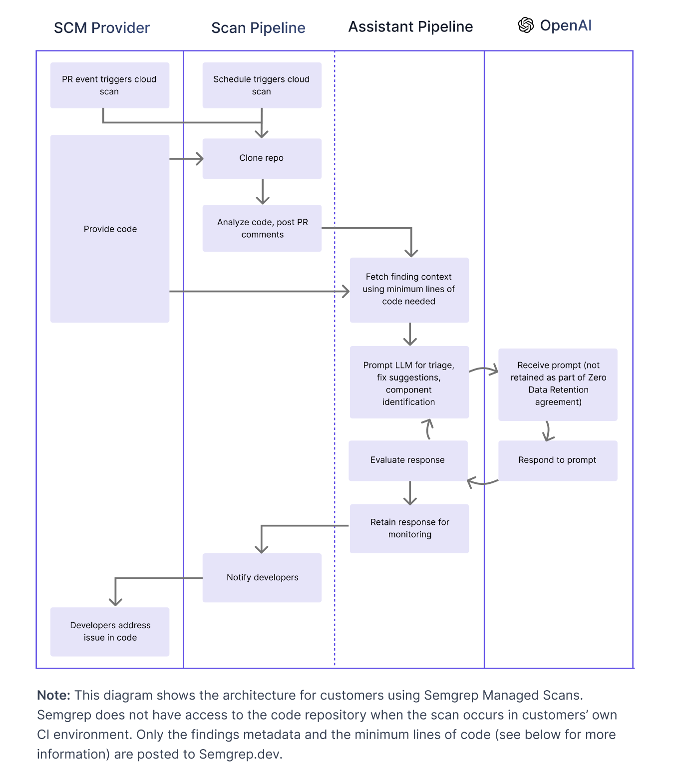 We also pass several dozen lines of code surrounding the finding in question to the model, alongside additional lines of code at each step of the finding’s data flow. This allows the LLM to get a fairly comprehensive understanding of what the code is doing, while also limiting how much code is passed to the LLM (for more on how we minimize the amount of data sent to and retained by AI partners, see our docs).