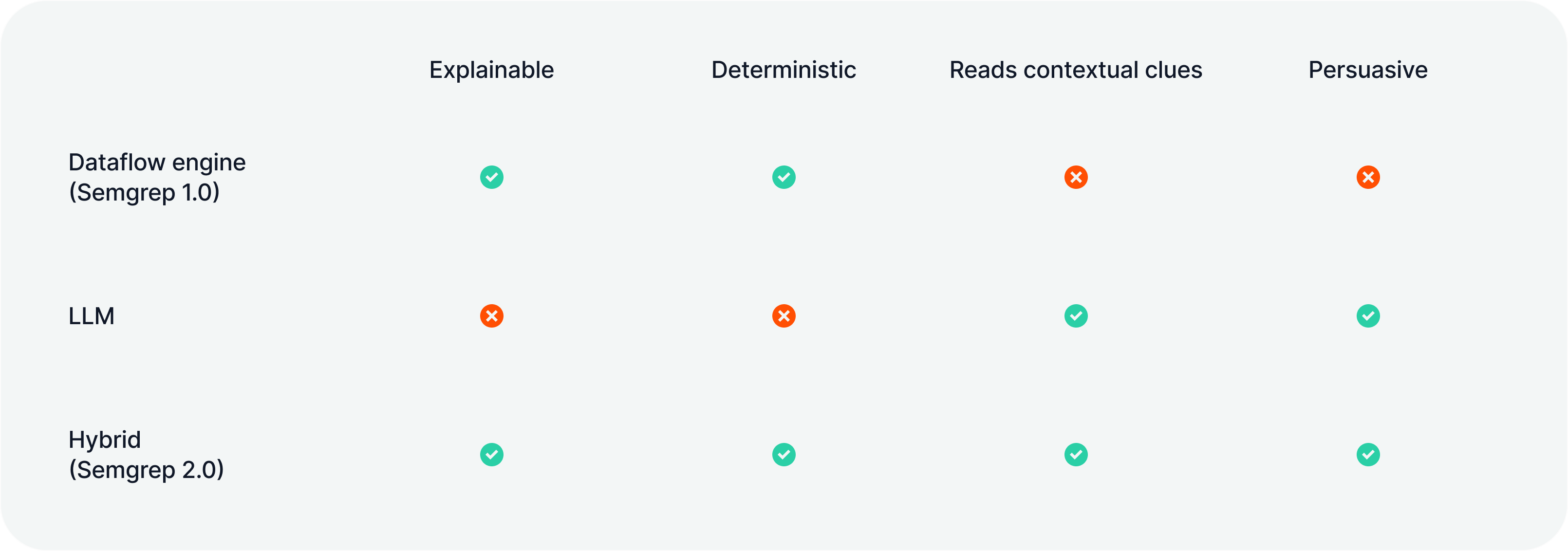 Semgrep Platform is now using a new hybrid engine we call Semgrep 2.0, that maintains both the rule-based determinism of Semgrep 1.0 and the persuasive, context-aware communication of an LLM. Here's how we think about it:
